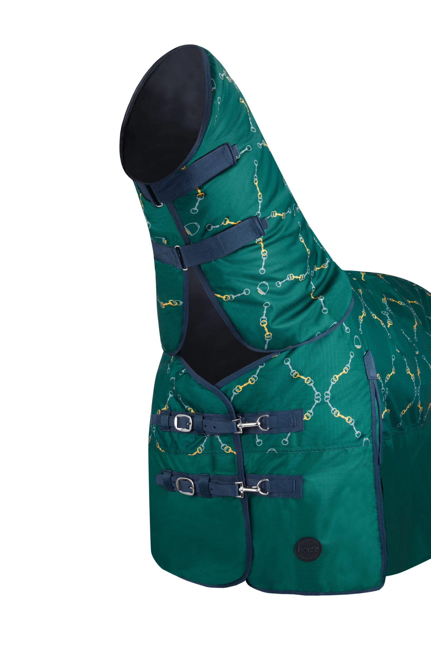 Decke dein Pferd mit dieser schönen Decke ein, um es vor Kälte und Regen zu schützen. Sie ist aus strapazierfähigem Stoff mit Gebissprint gefertigt und mit zwei Vorderschnallen, Beinriemen, Kreuzgurten und einem Schweiflatz ausgestattet. Hohe Gehfalten schränken die Bewegungsfreiheit deines Pferdes nicht ein. Das Halsteil schließt leicht mit Klettverschlüssen. Auch ohne Halsteil erhältlich.